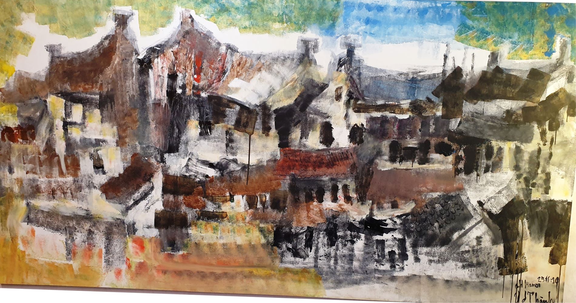 Tranh phố của Văn Dương Thành được nhìn từ xa với mảng nhà, tường, đường hẻm liên kết với nhau nổi bật trên nền những đám mây sáng rực ở phía xa. Nhìn kĩ sẽ thấy rất nhiều mái nhà trăm năm cũ, những cây cột điện nghiêng nghiêng, những mạng lưới điện giăng giăng chằng chịt, cả những ban công có con tiện nhỏ bé, mái hiên trĩu nặng lụp xụp, những cầu thang lộ thiên nhỏ hẹp chạy giữa những bể nước, ống máng nước mưa bằng sành nung, cả quần thể đó nhưng kể câu chuyện của bao mảnh đời, của nhiều thế hệ đã sống qua trong những ngôi nhà cũ kĩ này, chính màu thời gian đã làm nên sự quyến rũ và cái đẹp rất độc đáo, rất thương nhớ, hoài niệm